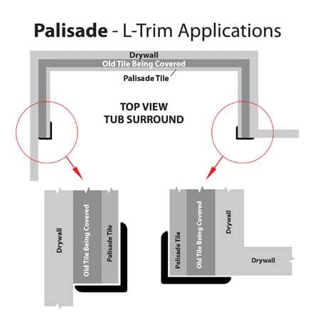 L-Trims are used to cover existing exposed tiles to provide a finished look (see drawing below). Install by dispensing a thin bead of sealant on the Palisade side and a thin bead of adhesive on the substrate side. Press trim into place. If trim will not stay in place, use some masking or painter’s tape to hold until adhesive sets.