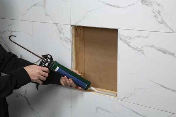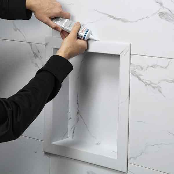 Place a bead of adhesive along the bottom of the opening where the shower niche will be resting, no need to apply adhesive on the sides or top of the opening.