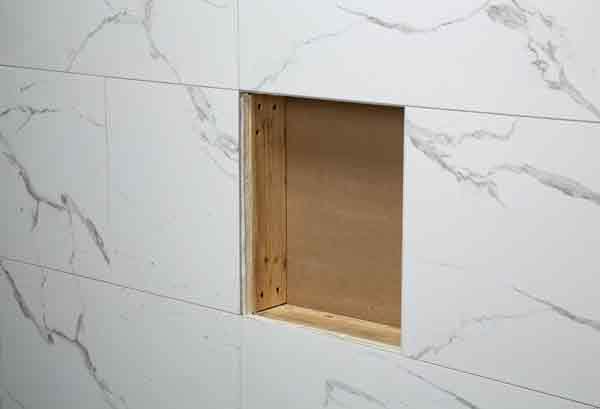 It is best to plan ahead and cut and build your shower niche location prior to tiling your wall. We suggest the location be away from direct shower spray.